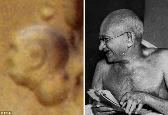 美国宇航局的科学家指出,1976年拍到的“火星脸”是太阳照射角度导致的一种错觉,在浏览欧洲火星探测器向地球传回的精彩火星照片时,你会看到被薄雾笼罩的火山和巨大的陨坑,除此之外,你还能看到更令人吃惊的景象——刻在岩石上的印度之父甘地头像。