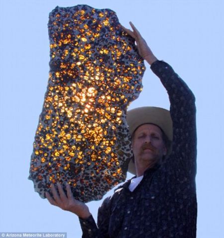 亚利桑那州西南陨石实验室的马文-基尔格莱手举一片阜康陨石。阳光穿过时,这种罕见的陨石金光闪闪,展现出令人吃惊的美。2008年,阜康陨石的最大一块在纽约Bonham拍卖行拍卖,起拍价为200万美元,但一直无人问津。完整的阜康陨石重量与一辆小汽车相当。
