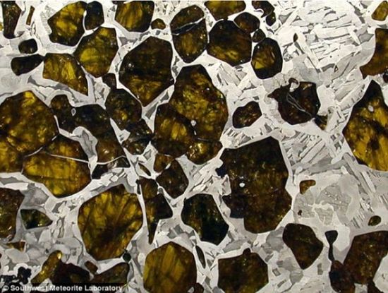 北京时间4月17日消息,据国外媒体报道,坠落地球表面后,没有任何迹象表明阜康陨石不起眼的外表下拥有惊人的内在美,只有切开之后,你才能真正了解这种陨石令人叹为观止的内部景象。阜康陨石内,半透明的黄金色橄榄石晶体闪闪发光,镍-铁则泛着银光,整个内部结构好似一个蜂巢。